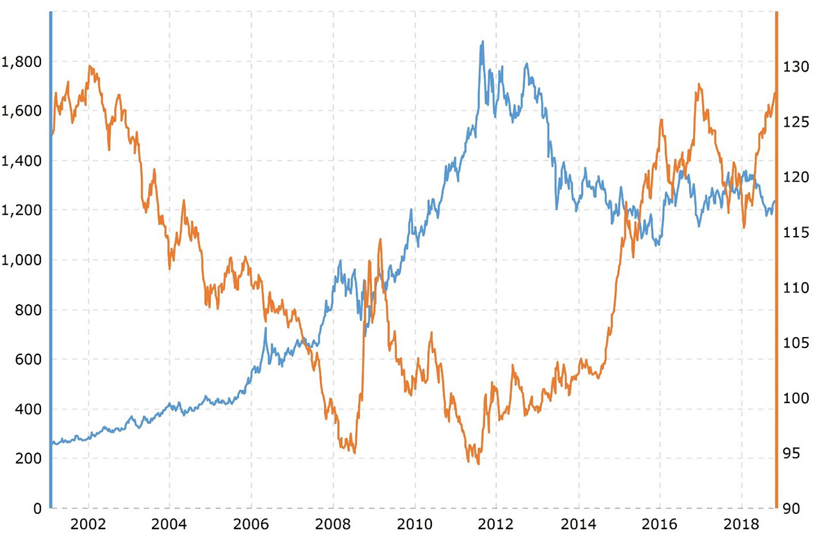 美元作為主導國際貿易和交易的全球最重要儲備貨幣的強勢對金融市場產生巨大影響 世界各地,從而影響黃金價格。這是金價的主要驅動力。貿易加權美元是一種常用的衡量指標 美元的購買力以及其對其他貨幣升值和貶值的後果。對其他國家的出口變得更多 隨著美元升值而昂貴,而進口變得更便宜。當美元貶值時,例如通過寬鬆的貨幣政策,金價 呈反比例上升趨勢。當美元貶值時,許多投資者湧向黃金作為替代貨幣。當黃金價格趨於下跌時 貿易加權美元升值。