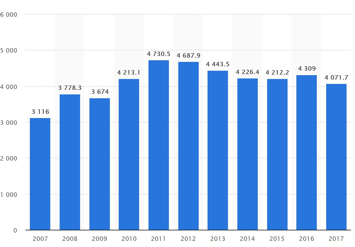 2007 年至 2017 年全球黃金需求(公噸)