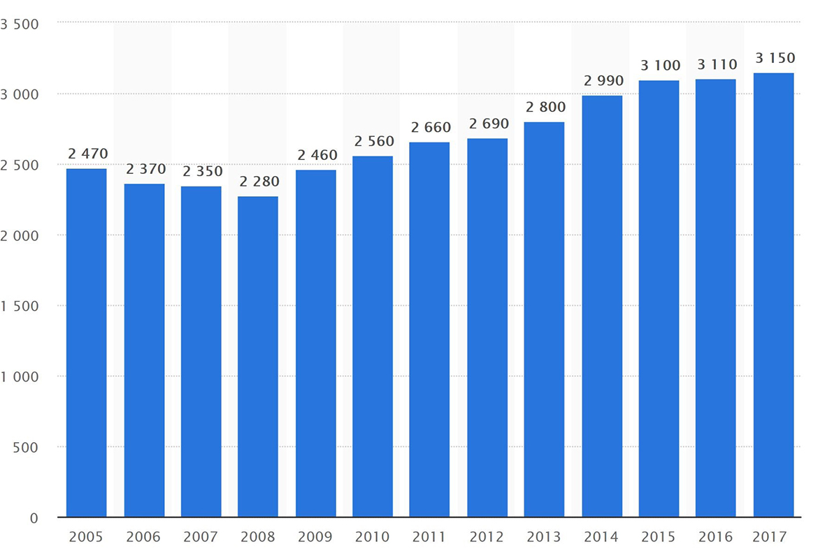 2005 年至 2017 年全球礦山黃金產量(公噸)